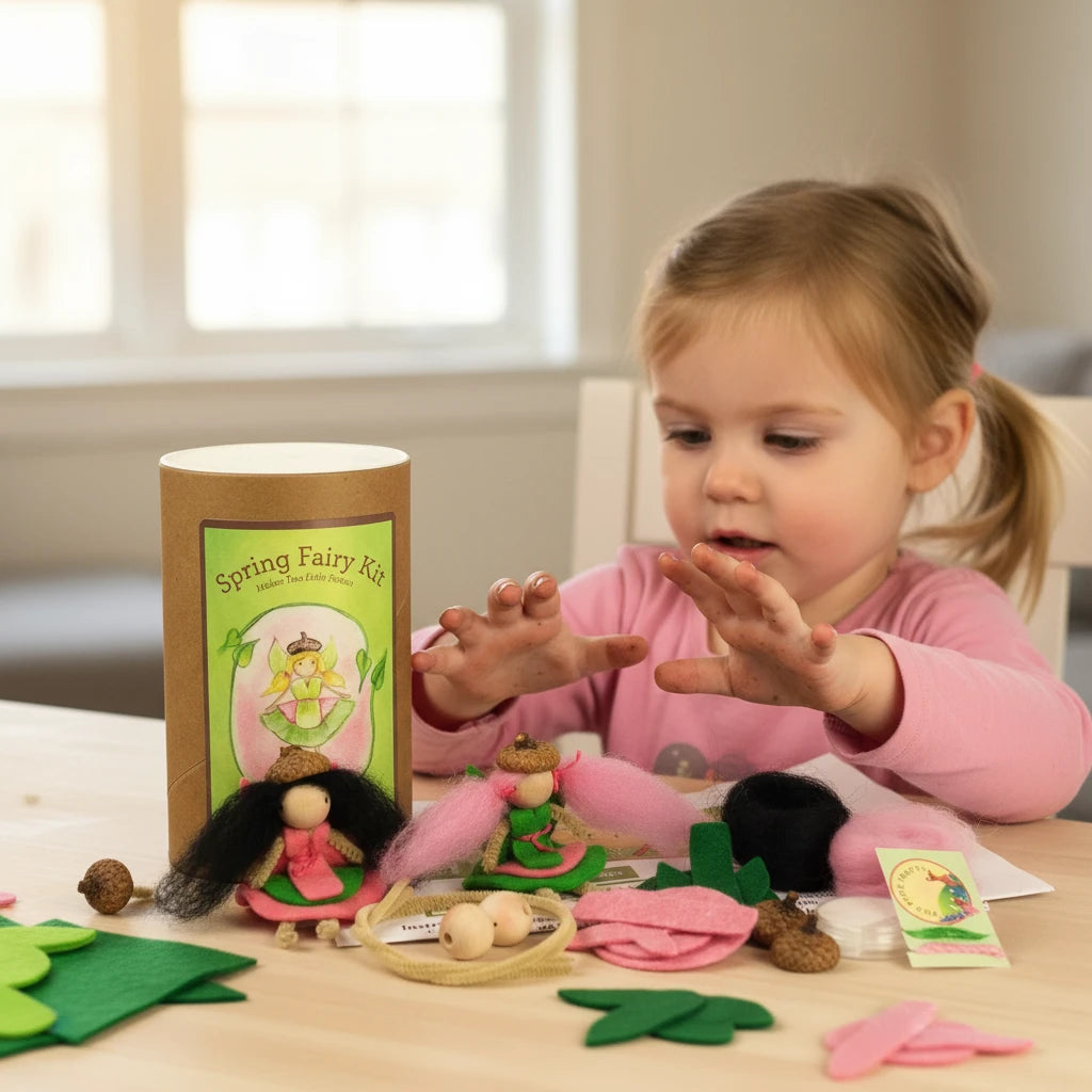 Dive into a world of magic with this delightful craft kit, packed with everything you need for hours of imaginative fun! Handmade with care in Minneapolis, MN, each set lets you create two charming seasonal fairies dressed in soft wool felt outfits, wool hair, and an adorable acorn hat. All the supplies you need are right here—just add your creativity!
