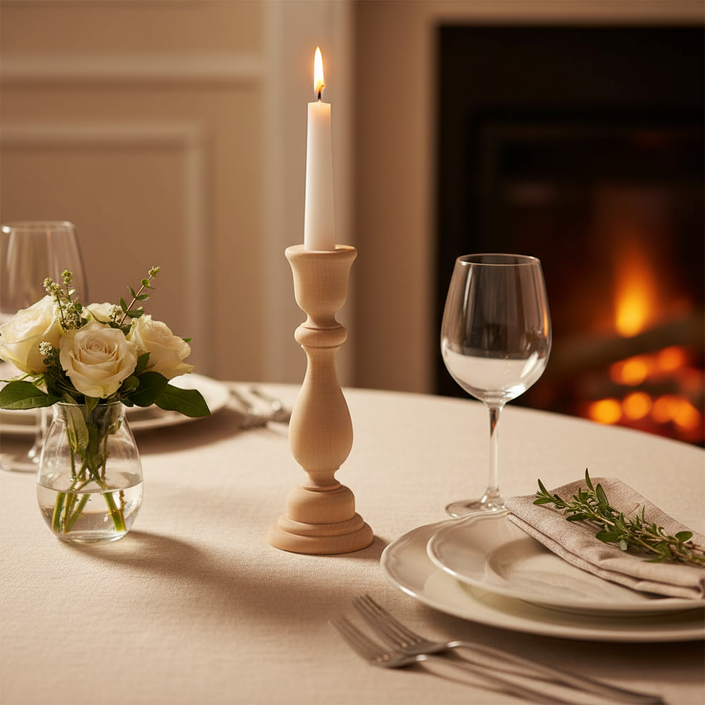 Select a finely crafted wooden candlestick holder that combines durability with elegance. Made from solid Baltic birch, these holders feature a timeless shape and a striking natural wood grain. Their smooth finish is ideal for painting or staining, though their natural beauty might be best left as is. Please remember to follow candle safety guidelines when in use.