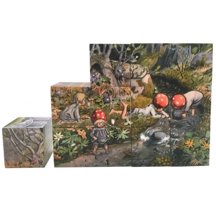 Six puzzle scenes from Elsa Beskow’s Children of the Forest (Tomtebobarnen) children's books. Elsa Beskow was a Swedish children's book writer and illustrator and very popular among Waldorf school families. -