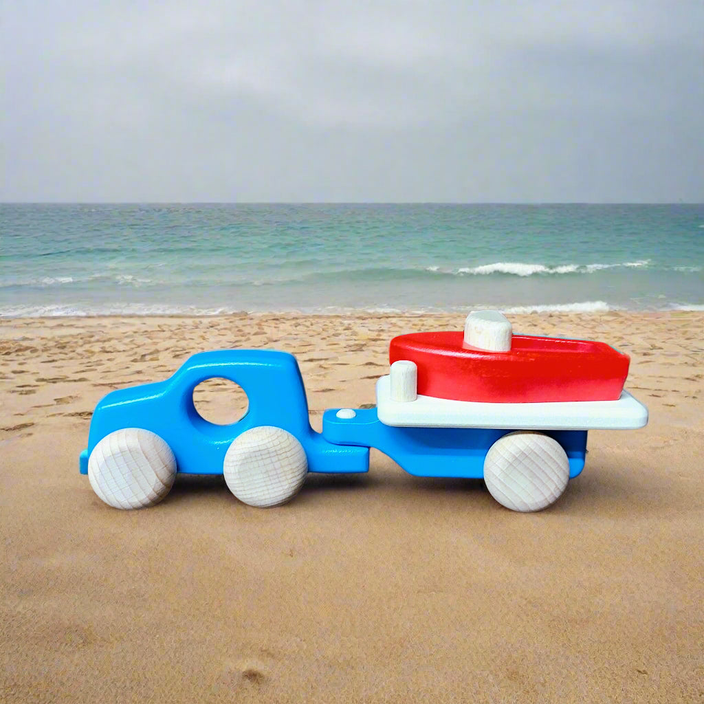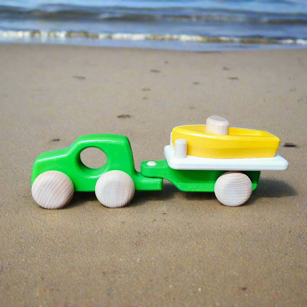 Feed your child's imagination and passion for vehicles with this charming car and boat toy set by BAJO. This set includes a vibrant truck with a detachable trailer and a colorful boat, all crafted from high-quality wood. It's designed to provide countless hours of creative play.