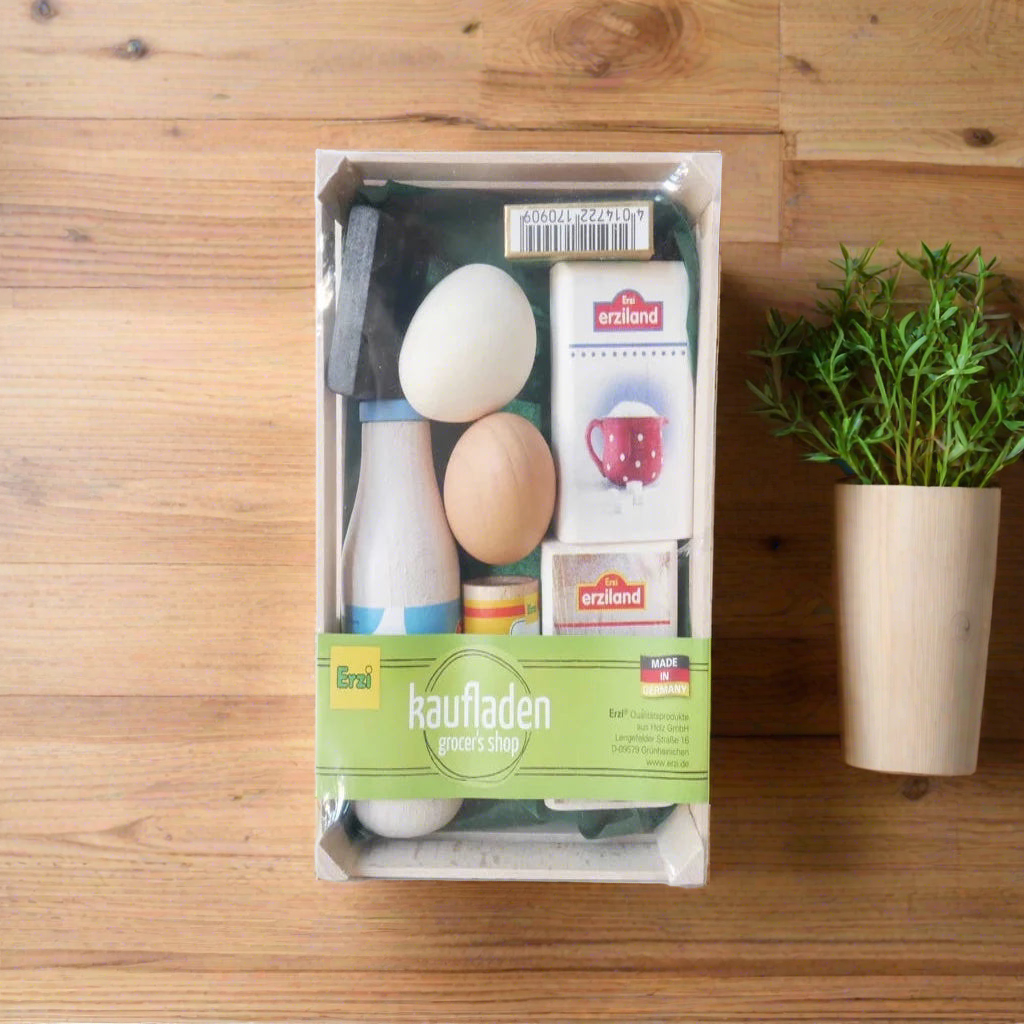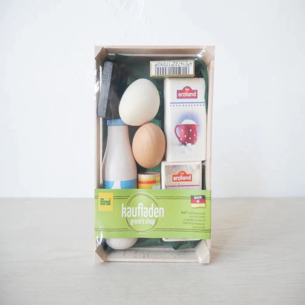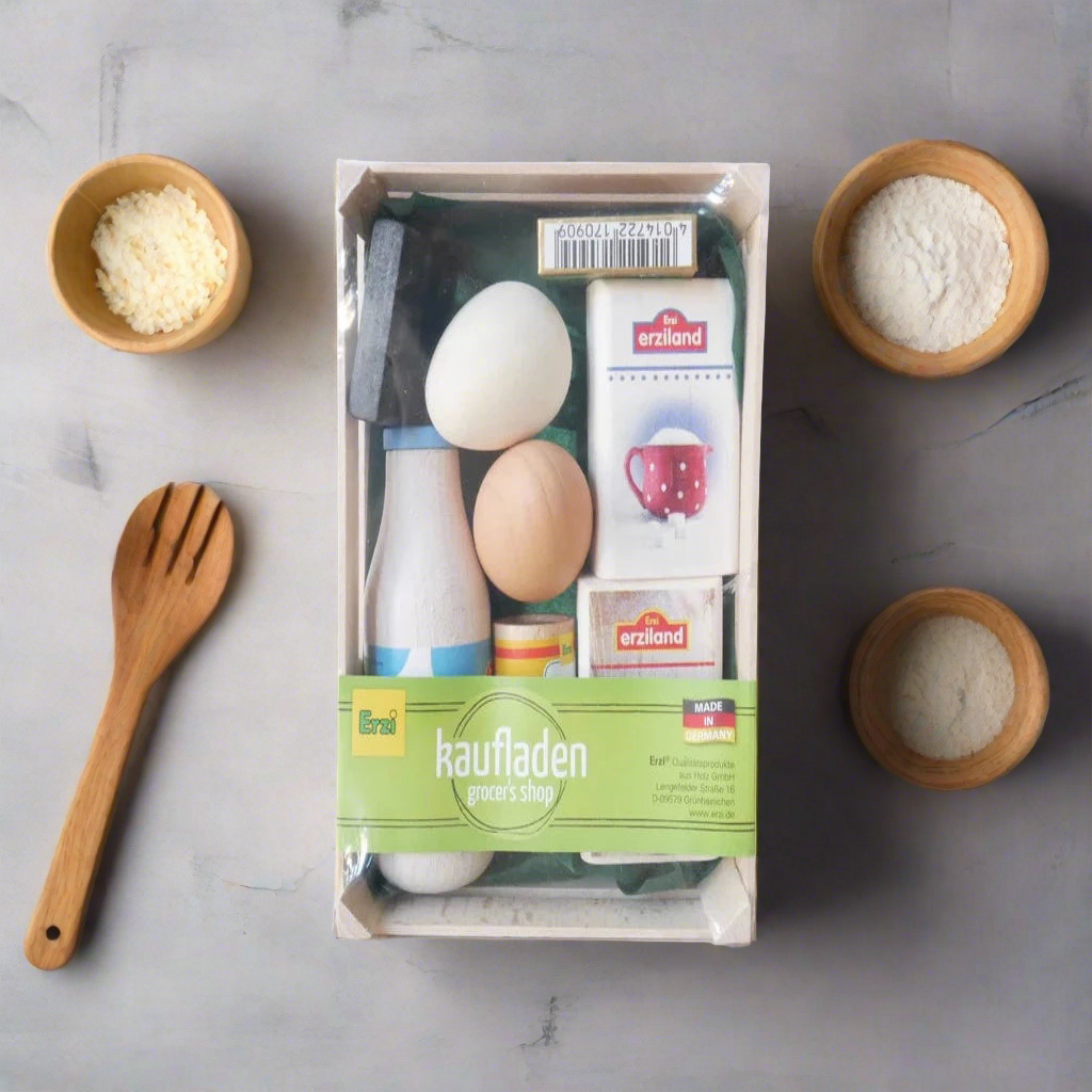 Inside the crate, you'll find a variety of ingredients that will make your pretend baking adventures come to life. From flour to sugar, chocolate chips to sprinkles, and baking powder to vanilla extract, this set has everything you need to create delicious imaginary treats.