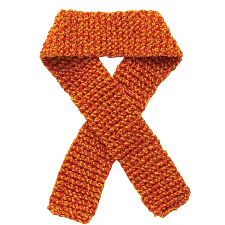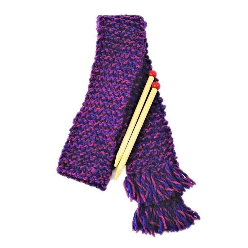 Enhance your knitting skills with this complete kit. It includes 100% wool yarn, wooden knitting needles, and easy-to-follow instructions for creating a scarf. Using just the knit stitch, you will work 9 stitches across short needles, resulting in a thick, 2-color twisted scarf. The instructions even cover how to add fringe, with a crochet needle suggested for this step( crochet needle not included). This kit will have your child making scarves for all their friends and family in no time.